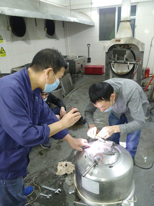 經(jīng)過1個多小時的車程,鄒漢基和李左賢趕到現(xiàn)場后,立即開始檢修,經(jīng)檢查確認是炒藥機的溫度傳感器探頭故障,電阻值偏離正常范圍導致傳感溫度失靈,而帶去的探頭都不合用,大家現(xiàn)場商議后,決定將帶去的傳感器探頭檢測元件與原來的探頭檢測元件駁接修復電阻值,經(jīng)過一番搶修,下午3點14分,故障排除,溫度顯示恢復正常,看到設備又可以正常開機了,大家臉上都露出了欣慰的笑容……
