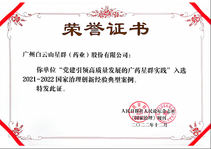 在貫徹落實廣藥集團(tuán)“123廣藥黨建”創(chuàng)新模式(明確一條主線——大黨建引領(lǐng)企業(yè)大發(fā)展,堅持兩個導(dǎo)向——黨建高標(biāo)準(zhǔn)和發(fā)展高質(zhì)量,強化三大引力——黨的領(lǐng)導(dǎo)力、組織力和創(chuàng)造力)標(biāo)準(zhǔn)的過程中,星群公司在2021年7月百年黨慶之際,探索實踐出“星火船心”,星群黨委被評為廣藥集團(tuán)先進(jìn)基層黨組織。在2023年年初,星群黨建創(chuàng)新項目課題《黨建引領(lǐng)高質(zhì)量發(fā)展的廣藥星群實踐》,從全國7000多項案例中脫穎而出,成為廣州市唯一企業(yè)入選《中國式現(xiàn)代化的生動實踐——2021-2022國家治理創(chuàng)新經(jīng)驗(黨建創(chuàng)新)典型案例》,這是由人民日報社指導(dǎo)、人民論壇雜志社主辦的“深入學(xué)習(xí)貫徹黨的二十大精神——第八屆國家治理高峰論壇年會”評選并權(quán)威發(fā)布。