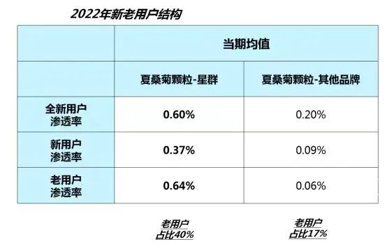 后疫情時代,國民經(jīng)過廣泛的健康教育后,健康意識普遍提高,科學(xué)營養(yǎng)需求更加旺盛。藥品細(xì)分時代到來,兒藥賽道呈現(xiàn)巨大生命力。根據(jù)中康科技CMH數(shù)據(jù),疫情三年,夏桑菊增長較總體感冒品類更穩(wěn)健而快速,是近年來備受關(guān)注的細(xì)分市場。中康科技智慧決策云中心產(chǎn)品總監(jiān)嚴(yán)礪寒表示,從小票數(shù)據(jù)來看,在快速增長的夏桑菊市場中,星群夏桑菊以50%的份額穩(wěn)居第一,在感冒品類中每100位購藥用戶中有1.61人購買星群夏桑菊,其中老用戶占比40%。”