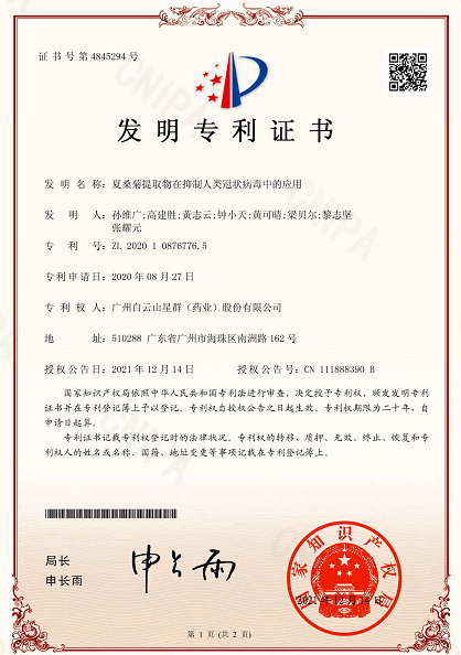 2020年,星群公司與中國中醫(yī)科學院崔曉蘭教授團隊合作開展的“夏桑菊提取物在抑制人類冠狀病毒中的應用”研究成果,當年即獲得一項發(fā)明專利授權(quán),2022年又申請了澳門延伸保護,并己獲授權(quán)。
