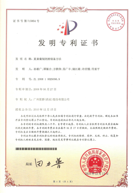 2016年,白云山星群憑“夏桑菊制劑的制備方法(專利號:ZL 2008 1 0029096.9) ”專利,首獲中國專利優(yōu)秀獎。
