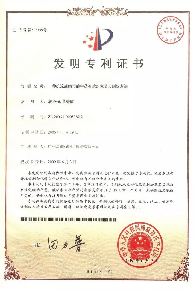 早在2009年,白云山星群已與香港科技大學合作研究,用分子生物學的方法揭示了夏桑菊顆粒防治禽流感的作用。經(jīng)科學研究,以香港科技大學詹華強教授為首的研發(fā)團隊,證實“星群夏桑菊”配方有效部分成分具有殺滅甲型流感病毒H3N2亞型、高效病性禽流感病毒株H5N1亞型和乙型流感病毒株的作用,并獲得中國發(fā)明專利的授權。