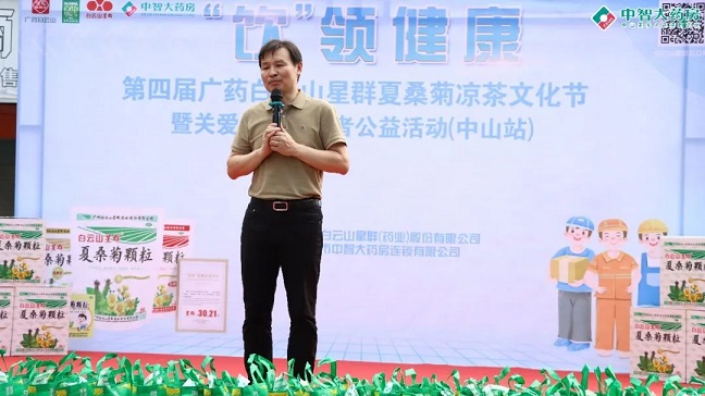 白云山星群公司總經(jīng)理賀慶在臺(tái)上致辭:"涼茶作為中國(guó)傳統(tǒng)文化的一部分,在炎炎夏日,一杯涼茶不僅能消暑解渴,更能帶來心靈的慰藉。我們白云山星群藥業(yè)將通過舉辦涼茶文化節(jié)的形式,向廣大市民普及涼茶知識(shí),推廣健康生活方式,同時(shí)也讓戶外工作者們感受到社會(huì)的溫暖與關(guān)懷。白云山星群夏桑菊在涼茶類產(chǎn)品是產(chǎn)品的領(lǐng)導(dǎo)者,占有絕對(duì)的市場(chǎng)份額,白云山星群和中山中智在業(yè)務(wù)上保持著強(qiáng)勁的戰(zhàn)略合作伙伴關(guān)系,我們也希望能為廣大消費(fèi)者提供更齊全、更專業(yè)的藥品服務(wù)。關(guān)愛環(huán)衛(wèi)工人,白云山星群藥業(yè)一直在行動(dòng),今后,我們也會(huì)聯(lián)合更多的連鎖共同開展系列公益活動(dòng),為共建和諧美好的社會(huì)盡一份力量!”