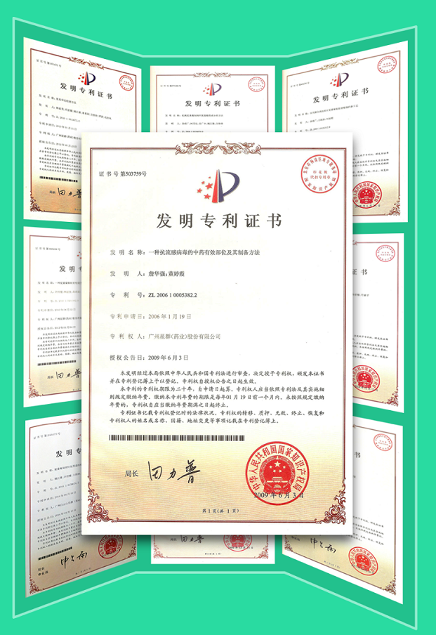 近年來,白云山星群不斷對星群夏桑菊展開深入研究,迄今已涌現(xiàn)10余項高質量專利成果,其中包括“一種抗流感病毒的中藥有效部位及其制備方法”專利、“夏桑菊提取物在抑制人類冠狀病毒中的應用”專利、“夏桑菊在制備防治手足口病的藥物中的新應用”專利……專利矩陣夯實了星群夏桑菊顆粒劑的核心產品競爭力。