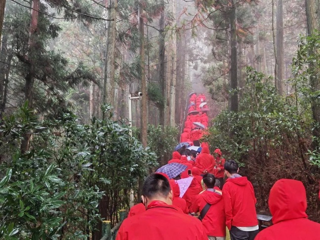在黃洋界,星群學(xué)員們冒著漫天風飛雨霧,身臨當年的戰(zhàn)地工事天險,并登頂黃洋界哨口。面對朱德同志手書“黃洋界保衛(wèi)戰(zhàn)勝利紀念碑”,品讀毛澤東詞《西江月·井岡山》的鐫刻圖雕,感嘆“敵軍圍困萬千重,我自巋然不動”的英雄氣概!