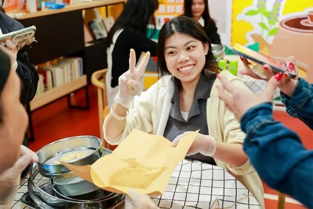 在夏桑菊顆粒制作體驗區(qū),在工作人員的指導下,市民朋友們體驗從涼茶到夏桑菊顆粒制備的成粒、過篩過程。成功完成體驗的市民,現(xiàn)場試飲夏桑菊飲料,體驗收獲感滿滿。