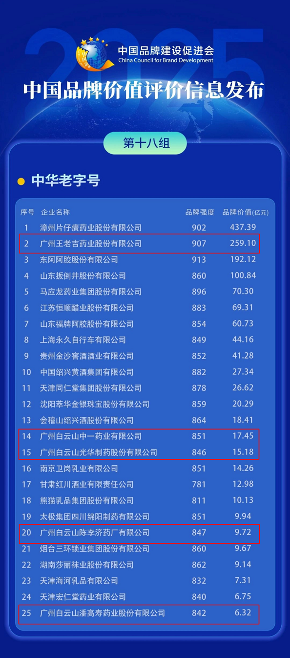 作為世界500強(qiáng)企業(yè)廣藥集團(tuán)旗下上市公司,廣藥白云山擁有13家中華老字號,其中11家已超百年歷史。在活動現(xiàn)場,2025中國品牌價值評價信息中華老字號品牌榜單同步發(fā)布。其中,廣藥白云山旗下王老吉藥業(yè)、白云山中一、白云山光華、白云山陳李濟(jì)、白云山潘高壽榮登中華老字號品牌榜,進(jìn)入榜單25強(qiáng)。