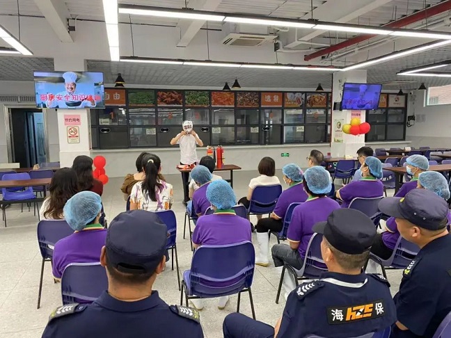保衛(wèi)部消防專員方慶宇為飯?zhí)霉ぷ魅藛T講解各項消防設(shè)施使用方法