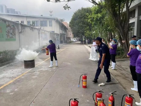 理論課程過后,全員在飯?zhí)猛饪盏胤纸M開展了實操演練。在消防專員指導(dǎo)下快速掌握“提、拔、握、壓”四步滅火法。