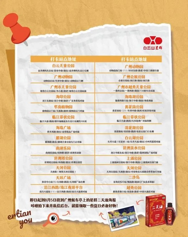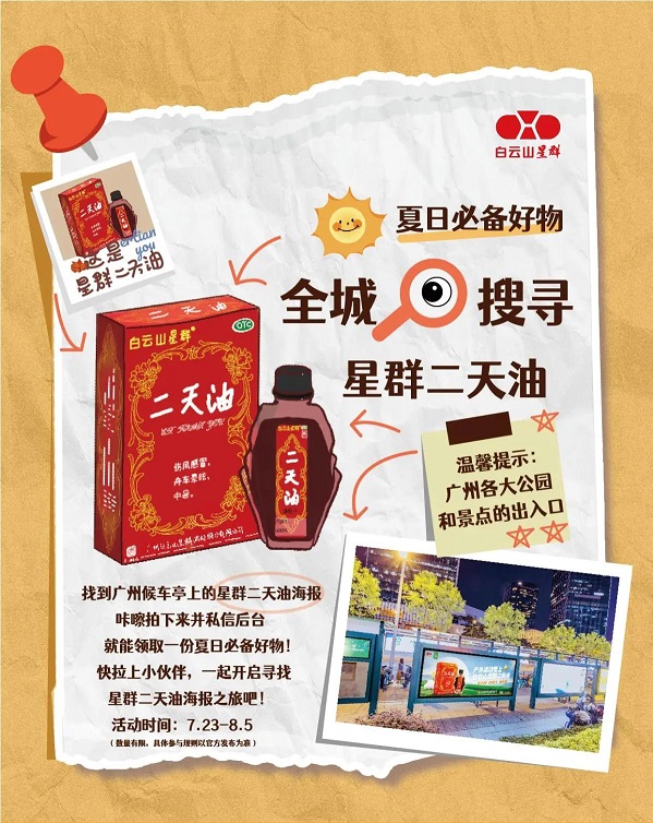 在廣州,公園是市民日常散步、鍛煉、休閑的熱門去處??紤]到戶外活動(dòng)時(shí)人員相對(duì)集中,蚊蟲叮咬風(fēng)險(xiǎn)較高,白云山星群精準(zhǔn)發(fā)力,在廣州 24 個(gè)公園、景區(qū)出入口的候車亭投放了醒目的廣告。當(dāng)市民準(zhǔn)備入園開啟休閑時(shí)光,或是到景點(diǎn)游玩觀光時(shí),都能一眼看到這些廣告。廣告?zhèn)鬟f的核心信息清晰明確 —— 戶外出行,記得帶上星群二天油。二天油作為白云山星群的特色草本產(chǎn)品,依托薄荷腦、薄荷油、冰片及由梔子、艾葉、血竭提煉制成黑油的復(fù)合配方,形成驅(qū)蚊防護(hù)網(wǎng),在一定程度上抵御蚊蟲侵?jǐn)_,幫助市民減少被蚊子叮咬的概率,從而降低感染基孔肯雅熱的風(fēng)險(xiǎn),讓大家能在戶外盡情享受自然與陽光。