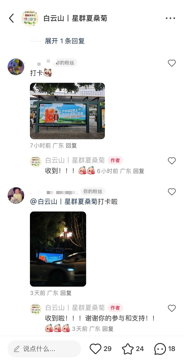 看到這些戶外廣告的市民,還能參與到有趣的線上互動(dòng)中。白云山星群在小紅書同步發(fā)起了 “拍立得” 活動(dòng),在廣告投放期間,市民只要拍下公園候車亭的星群二天油廣告,發(fā)布到白云山星群夏桑菊小紅書官方賬號(hào),就有機(jī)會(huì)獲得一份防蚊禮包。這樣的互動(dòng)活動(dòng),讓市民在出行途中既能收獲健康提示,又有機(jī)會(huì)贏取福利,受到不少人的關(guān)注。
