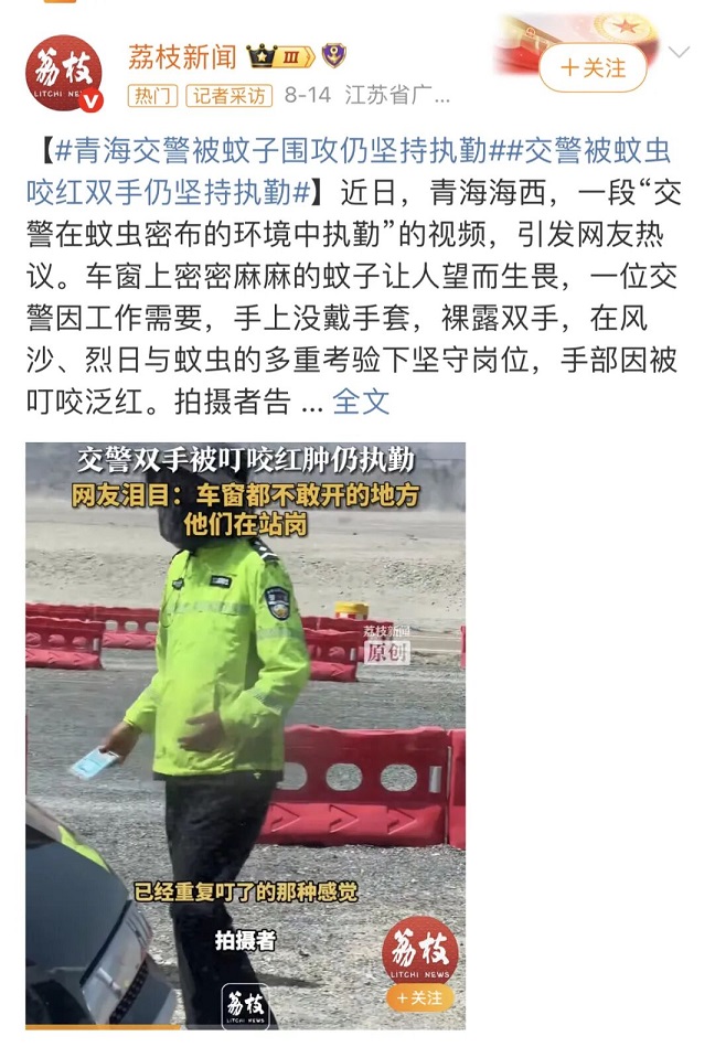 8 月中旬,一則關(guān)于青海交警執(zhí)勤時(shí)身上叮滿蚊子的新聞在網(wǎng)絡(luò)上引起熱議:畫面中,交警身著制服堅(jiān)守崗位,密密麻麻的蚊子叮滿衣服,他們只能不停抖動將衣服上的蚊子抖落。哪怕雙手被蚊子叮咬紅腫,仍然堅(jiān)持執(zhí)勤,從不懈怠。這一幕讓無數(shù)網(wǎng)友心疼不已,也讓更多人關(guān)注到高原地區(qū)公安民輔警的艱辛日常。盡管當(dāng)前蚊蟲高峰期已過,但在海西州這片廣袤的土地上,公安民輔警 “戰(zhàn)風(fēng)沙、斗烈日、抗蚊蟲” 的堅(jiān)守從未停歇 —— 他們頂風(fēng)冒雪堅(jiān)守路口疏導(dǎo)交通,頂著烈日在平直路段維護(hù)秩序,提醒游客避免疲勞駕駛,在蚊蟲密布的野外開展巡邏防控,用日復(fù)一日的執(zhí)著,筑起守護(hù)群眾平安的堅(jiān)固防線。